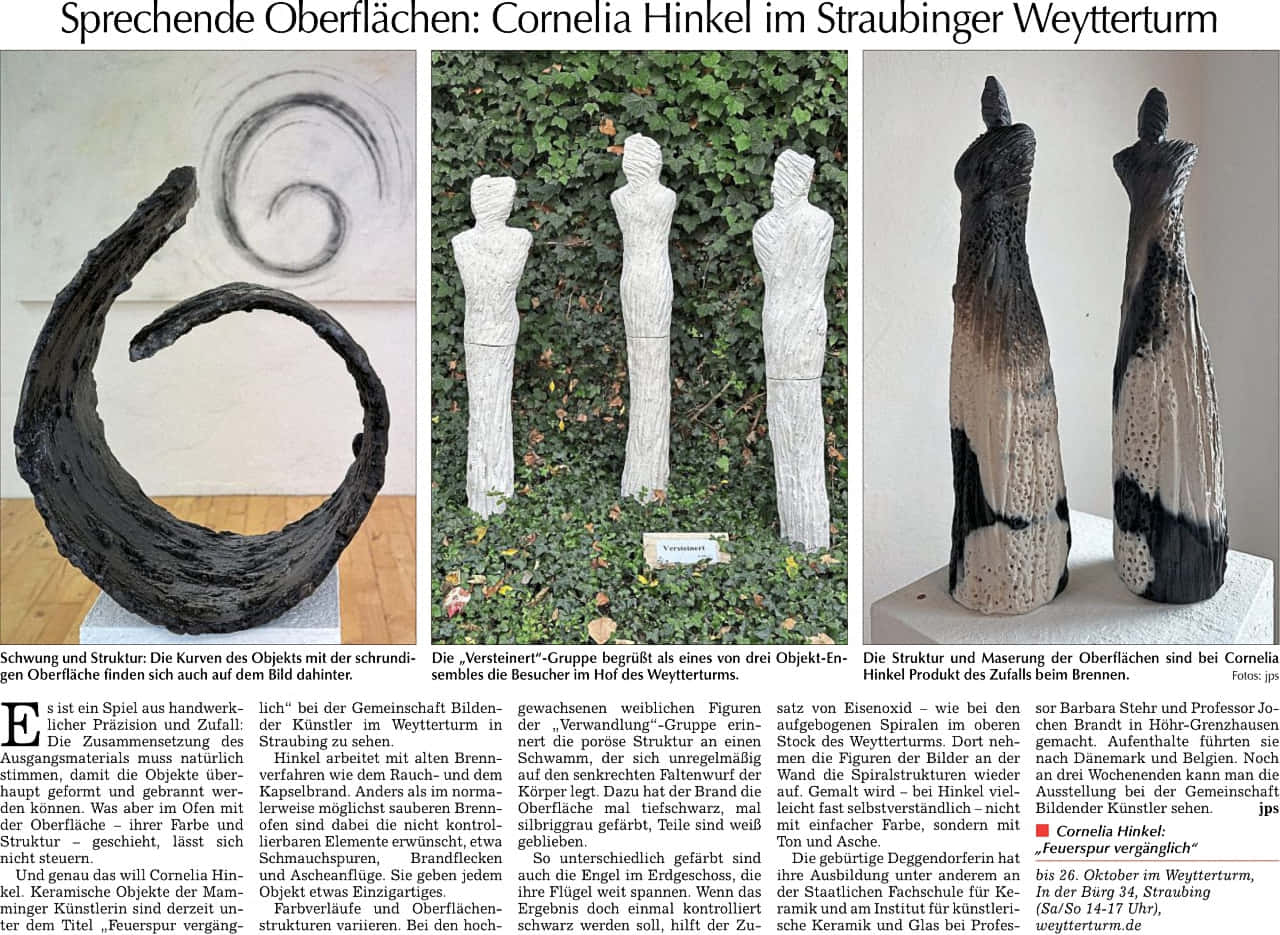 Die Gemeinschaft Bildender Künstler präsentiert in Zusammenarbeit mit dem Kulturamt der Stadt Straubing in der kommenden Ausstellung im Straubinger Weytterturm Arbeiten der Mamminger Künstlerin und Keramikerin Cornelia Hinkel.